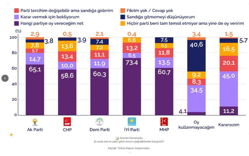 CHP ise yüzde 58,6 ile ana akım partiler arasında seçmen kararlılığı en düşük olan grup olarak öne çıktı.