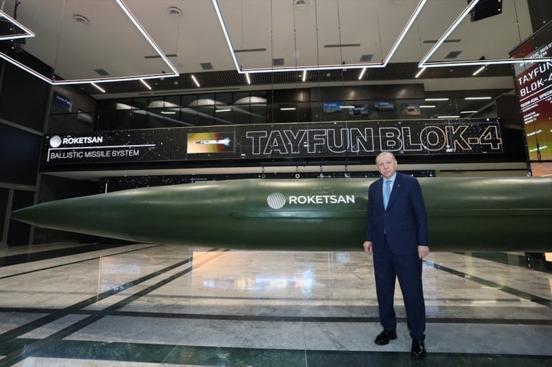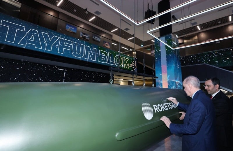 Cumhurbaşkanı Recep Tayyip Erdoğan, Salı günü Lalahan’daki ROKETSAN Üretim Tesisleri Açılışı, Seri Üretim Teslimatları ve Temel Atma Töreni’nde Tayfun Blok-4 balistik füzesine imza attı.