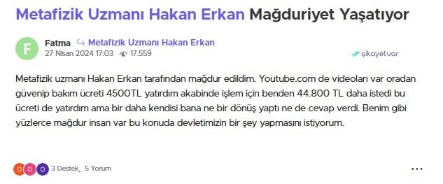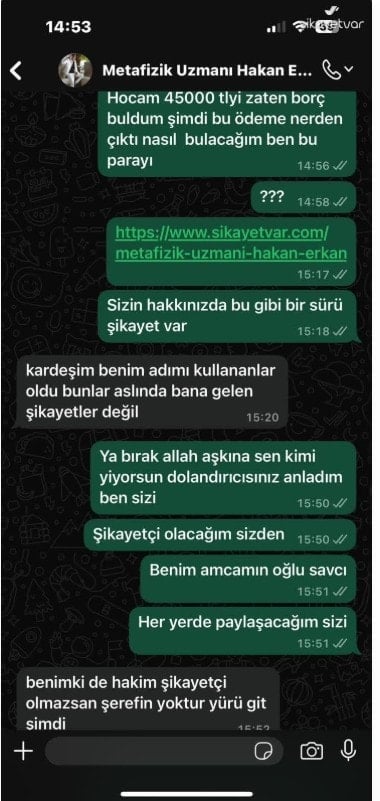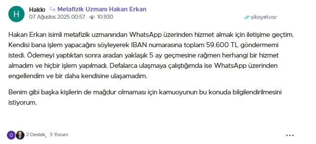 Hakkı isimli bir vatandaş, “Hakan Erkan isimli metafizik uzmanından WhatsApp üzerinden hizmet almak için iletişime geçtim. Kendisi bana işlem yapacağını söyleyerek IBAN numarasına toplam 59.600 TL göndermemi istedi. Ödemeyi yaptıktan sonra aradan yaklaşık 5 ay geçmesine rağmen herhangi bir hizmet almadım ve hiçbir işlem yapılmadı. Defalarca ulaşmaya çalıştığımda ise WhatsApp üzerinden engellendim ve bir daha kendisine ulaşamadım. Benim gibi başka kişilerin de mağdur olmaması için kamuoyunun bu konuda bilgilendirilmesini istiyorum” dedi.