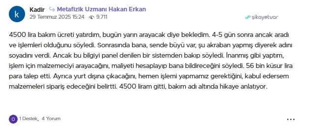 4500 lira bakım ücreti yatırdım, bugün yarın arayacak diye bekledim. 4-5 gün sonra ancak aradı ve işlemleri olduğunu söyledi. Sonrasında bana, sende büyü var, şu akraban yapmış diyerek adını soyadını verdi. Ancak bu bilgiyi panel denilen bir sistemden bakıp söyledi. İnanmış gibi yaptım, işlem için malzemeciyi arayacağını, maliyeti hesaplayıp bana bildireceğini söyledi. 56 bin küsur lira para talep etti. Ayrıca yurt dışına çıkacağını, hemen işlemi yapmamız gerektiğini, kabul edersem malzemeleri sipariş edeceğini belirtti. 4500 liram gitti, bakım adı altında hikaye anlatıyor.