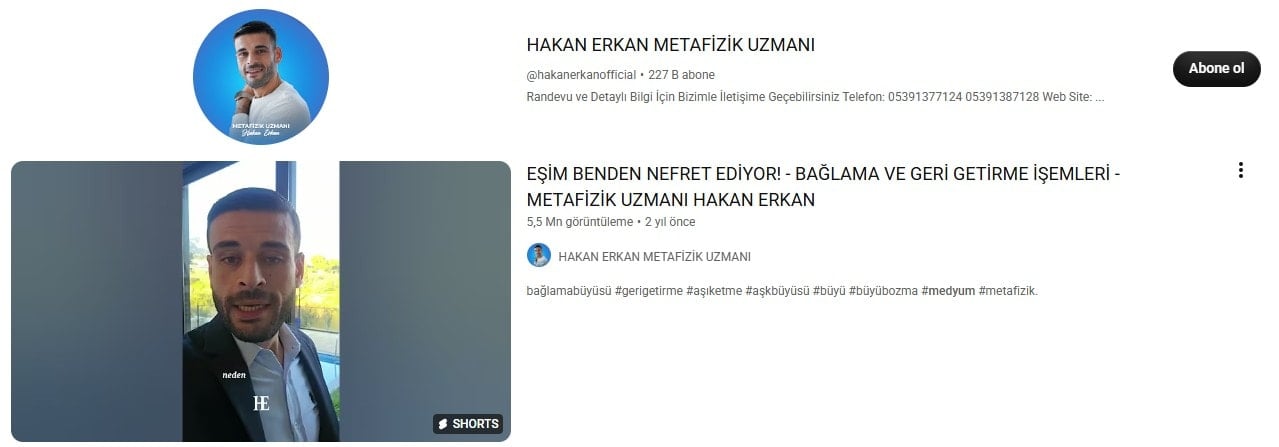 Üfürük Hakan Erkan’ın Youtube kanalının 227 bin takipçisi bulunuyor. En çok izlenen videosu ise ‘Eşim benden nefret ediyor – Bağlama ve Geri Getirme İşlemleri’ başlığıyla yayınladığı içerik… Söz konusu videoyu 5 buçuk milyon kişi izledi.