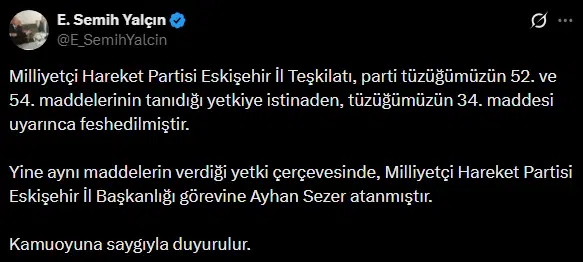 Yalçın, yaptığı yazılı açıklamada, “Milliyetçi Hareket Partisi Eskişehir İl Teşkilatı, parti tüzüğümüzün 52. ve 54. maddelerinin tanıdığı yetkiye istinaden, tüzüğümüzün 34. maddesi uyarınca feshedilmiştir. Yine aynı maddelerin verdiği yetki çerçevesinde, Milliyetçi Hareket Partisi Eskişehir İl Başkanlığı görevine Ayhan Sezer atanmıştır” dedi.