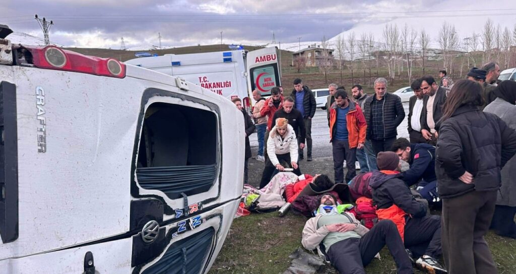 Van’da, akşam saatlerinde seyir halindeki minibüs, kayganlaştığı belirtilen yolda takla attı. Minibüste bulunan ve Van’daki dağcılık faaliyetlerine katıldıkları öğrenilen yolcular, çarpmanın etkisiyle araç içerisinde sıkıştı. İhbar üzerine olay yerine çok sayıda ekip sevk edildi.