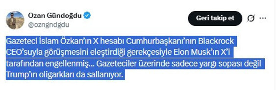 Gazeteci Ozan Gündoğdu, Gazeteci İslam Özkan’ın kişisel X hesabının Cumhurbaşkanı Erdoğan’ın Blackrock CEO’suyla görüşmesini eleştirdiği için Elon Musk tarafından engellendiğini öne sürerek, “Gazeteciler üzerinde sadece yargı sopası değil Trump’ın oligarkları da sallanıyor.” ifadelerini kullandı.
