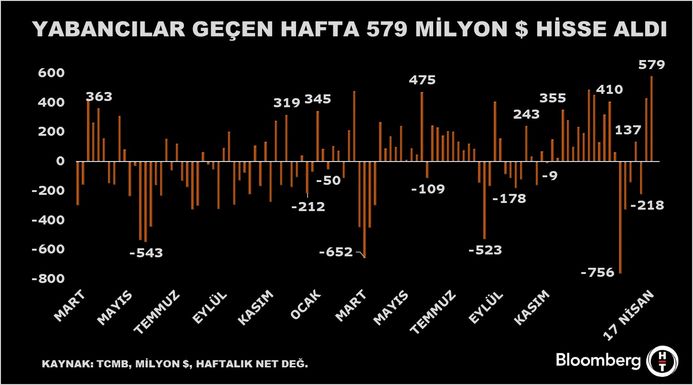 Yabancı yatırımcı geçen hafta 579,4 milyon dolarlık hisse aldı. Önceki alım 430 milyon dolar seviyesindeydi.