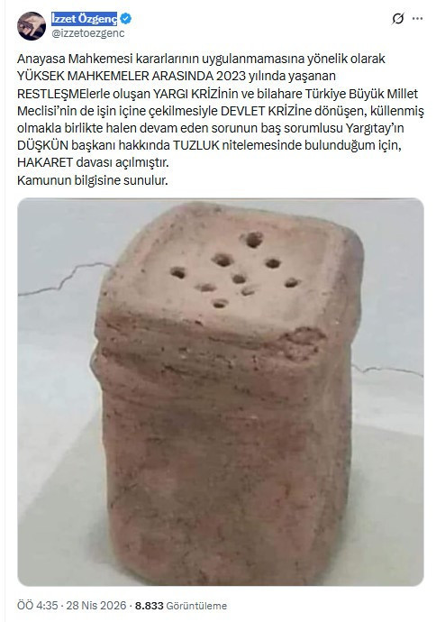 İzzet Özgenç hakkında başlatılan “hakaret” davasını kişisel sosyal medya hesabından “Anayasa Mahkemesi kararlarının uygulanmamasına yönelik olarak YÜKSEK MAHKEMELER ARASINDA 2023 yılında yaşanan RESTLEŞMElerle oluşan YARGI KRİZİnin ve bilahare Türkiye Büyük Millet Meclisi’nin de işin içine çekilmesiyle DEVLET KRİZİne dönüşen, küllenmiş olmakla birlikte halen devam eden sorunun baş sorumlusu Yargıtay’ın DÜŞKÜN başkanı hakkında TUZLUK nitelemesinde bulunduğum için, HAKARET davası açılmıştır. Kamunun bilgisine sunulur.” ifadeleriyle duyurdu.