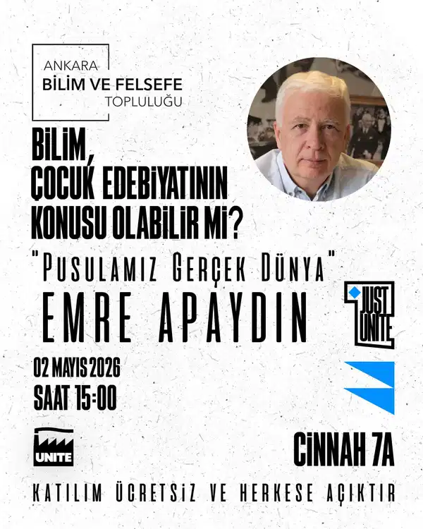 Ankara Bilim ve Felsefe Topluluğu, “Bilim, Çocuk Edebiyatının Konusu Olabilir Mi?” sorusunun yanıtını, düzenlediği etkinlikle verecek. Etkinlik kapsamında, yazar Emre Apaydın, “Pusulamız Gerçek Dünya” isimli kitabının yazılış sürecini ve içeriğini anlatmak üzere sanatseverlerin karşısına çıkacak. Ankara Unite Ortak Mekan’da ücretsiz ve herkese açık olarak düzenlenecek olan etkinlik, 2 Mayıs saat 15.00’te yaşama geçirilecek.