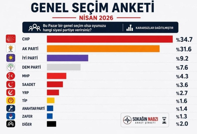 CHP, yüzde 34,7 oy oranıyla birinci parti konumunu sürdürürken, iktidar partisi AK Parti yüzde 31,6 ile ikinci sırada yer aldı.
