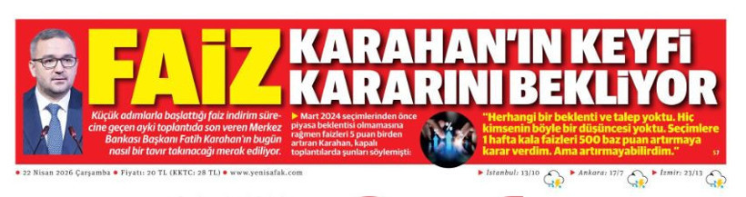 Para Politikası Kurulu’nun (PPK) bugün açıklayacağı faiz kararı öncesinde Yeni Şafak, “Faiz, Karahan’ın keyfi kararını bekliyor” başlığıyla manşet verdi. Haberde, Merkez Bankası Başkanı’nın geçmişteki bir kapalı toplantı sırasında sarf ettiği iddia edilen, “Herhangi bir beklenti yoktu, faizleri 500 baz puan artırmaya ben karar verdim, ama artırmayabilirdim” şeklindeki ifadelerine vurgu yapıldı. Bu çıkışla, kurumsal bir politika yerine kişisel kararların ön planda olduğu iması yapıldı.