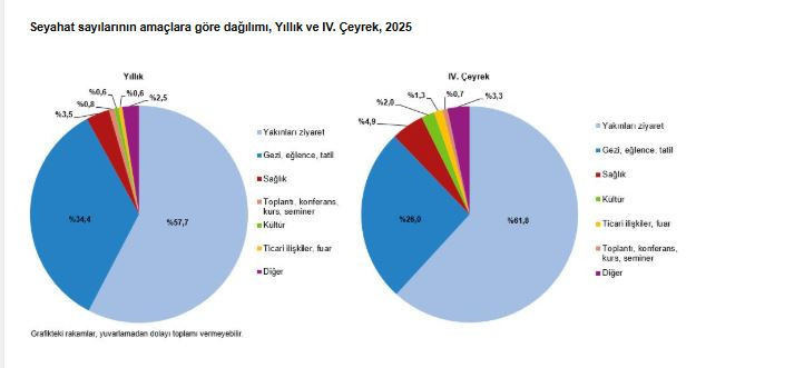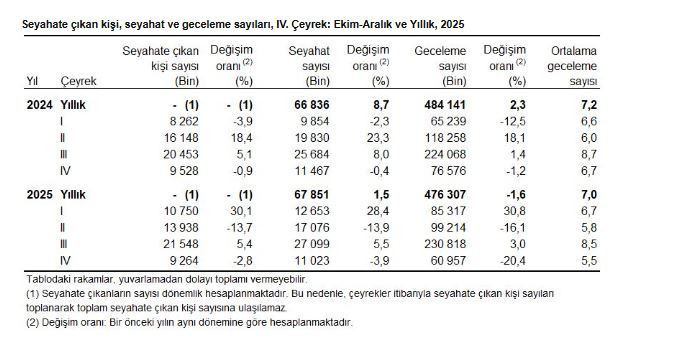 Türkiye İstatistik Kurumu (TÜİK), Seyahat sayısı 2025 yılında bir önceki yıla göre yüzde 1,5 artarak 67 milyon 851 bin olarak gerçekleşti. Bu yılda seyahate çıkanların yaptıkları toplam geceleme sayısı bir önceki yıla göre yüzde 1,6 azalarak 476 milyon 307 bin olarak gerçekleşti. Ortalama geceleme sayısı 7 gece olarak ortaya çıktı.