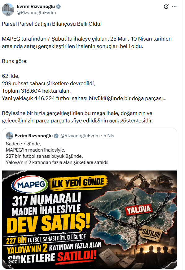 Rızvanlıoğlu konuyla ilgili yaptığı paylaşımda “Böylesine bir hızla gerçekleştirilen bu mega ihale, doğamızın ve geleceğimizin parça parça tasfiye edildiğinin açık göstergesidir” ifadelerini kullandı.