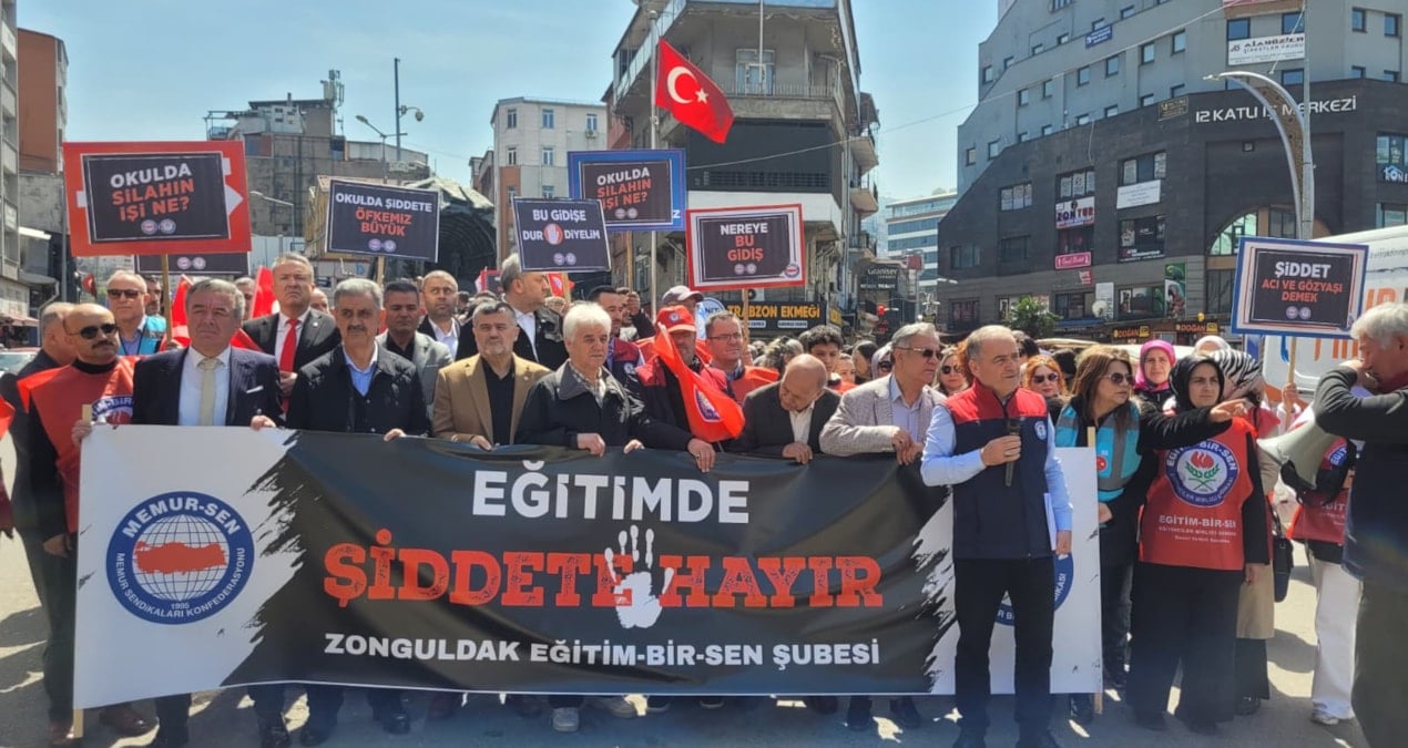 Grup adına basın açıklamasını okuyan Eğitim-Bir-Sen Zonguldak Şube Başkanı Kamuran Aşkar, öğretmenlerin can güvenliklerinden endişe duyduklarını belirtti. Eğitim çalışanlarının şiddetin açık hedefi haline geldiğini ifade eden Aşkar, şunları kaydetti:
